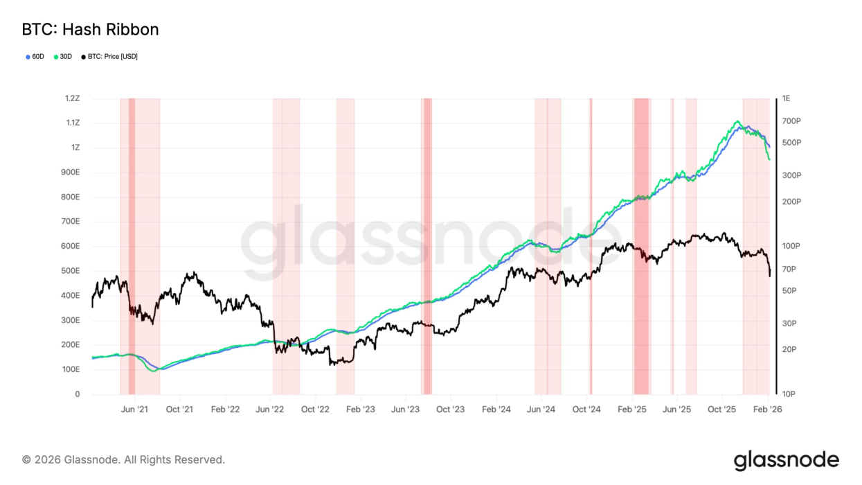 در همین حال، اندیکاتور Hash Ribbons نیز هشدار منفی صادر کرده است. میانگین متحرک ۳۰روزه هشریت به زیر میانگین ۶۰روزه سقوط کرده که در گذشته نشانهای از فشار شدید بر درآمد ماینرها و افزایش ریسک تسلیم بوده است.